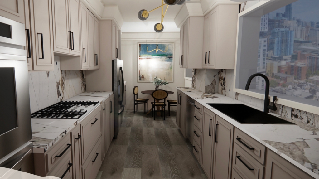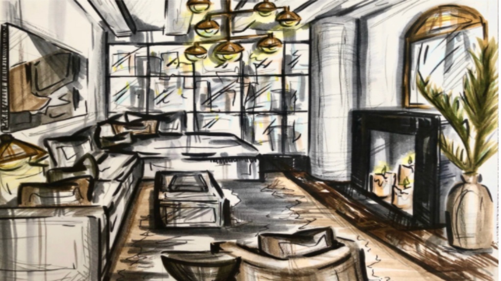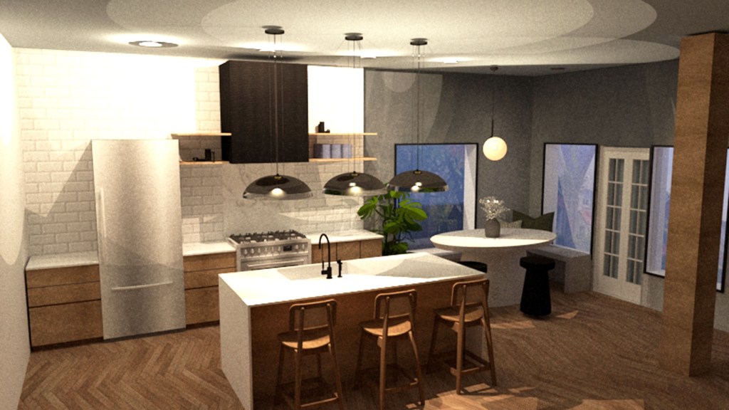 I created a living room design that blends modern and classic elements, such as a brass fireplace and stucco walls. I used my intuition to select and arrange the furniture and lighting to create an eclectic ambiance. The design was rendered using Sketchup, Enscape, and Photoshop.