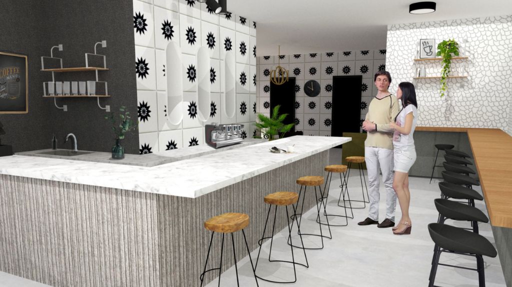This cafe floor plan and rendering was created for my Sheridan College Digital Communications class. The goal of this project was to take a pre-constructed building and create a floor plan that enhances the natural frame of the building. Software used: AutoCAD, Adobe Photoshop, SketchUp, V-Ray.