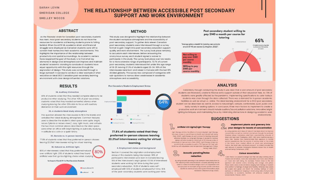 The Relationship Between Accessible Post Secondary Support and Work Environment Academic Research report was conducted as my fourth year thesis. This study was designed to highlight the relationship between the student workplace atmosphere and the accessibility of post-secondary support. To gather data eleven Canadian post-secondary students were interviewed through a survey format to gain insight into post-secondary education support quality and work environment. The survey took place remotely to accustom each interviewee. Before answering the anonymous survey, each student signed a waiver to participate in the study. The survey took place over two weeks for a more extensive range of participants.